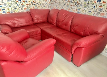 Красный угловой диван с креслом. Размер 1.90 х 2.25. Кожа натуральная